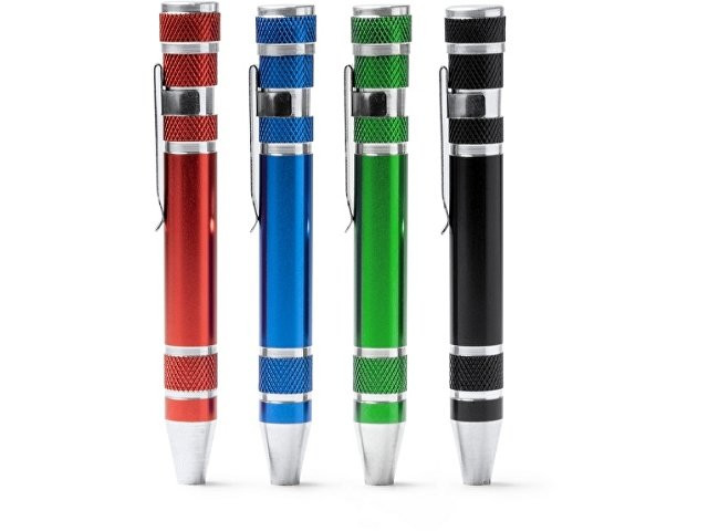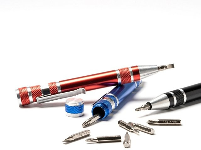 Алюминиевый мультитул в форме ручки. В комплекте 8 головок бит