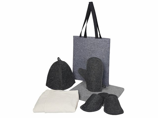 Расчет нанесенияЖенский банный набор "Healing" для комфортного отдыха: лежак для бани, холщовый килт-парео, рукавица, шапка и тапочки — всё аккуратно упаковано в стильный фетровый шоппер.