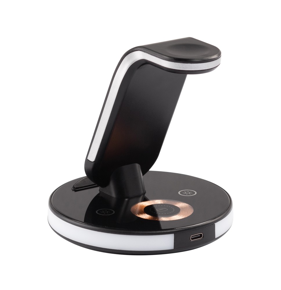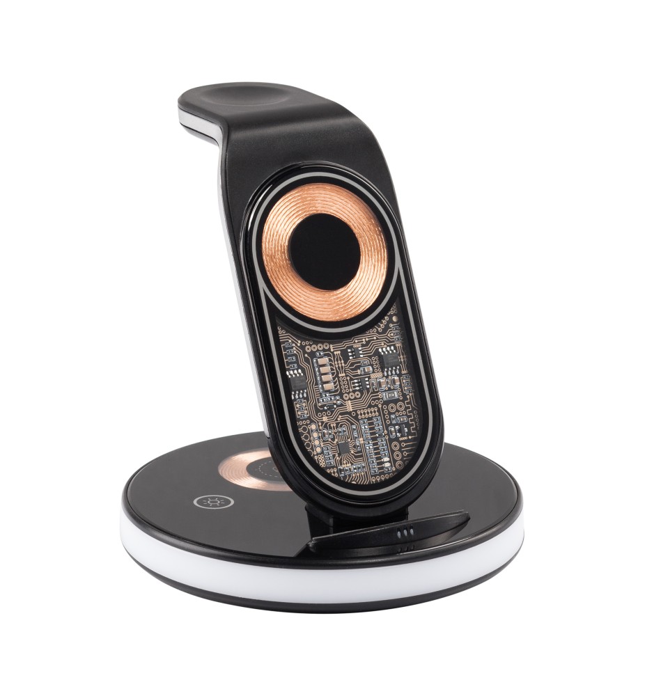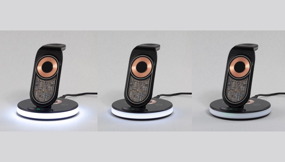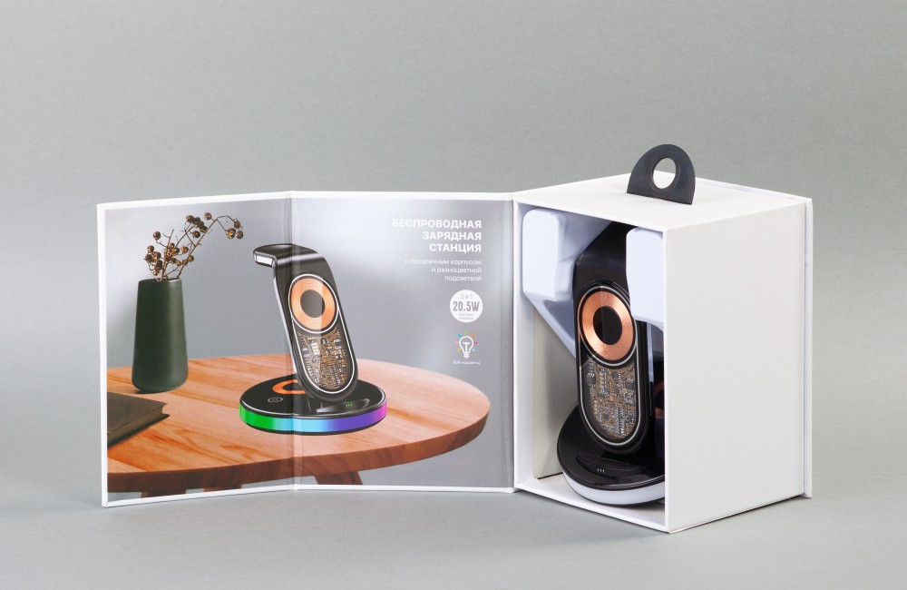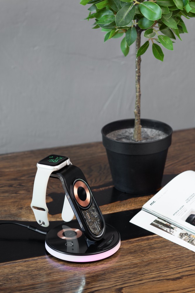 Оригинальный прозрачный дизайн корпуса-скелетона и быструю беспроводную зарядку всех Ваших смартфона, наушников и часов Apple Watch дополняют 2 световых режима - лампа-ночник с двумя уровнями яркости и разноцветная плавно меняющаяся RGB-подсветка. Управление режимами осуществляется сенсорными кнопками, находящимися на основании станции.