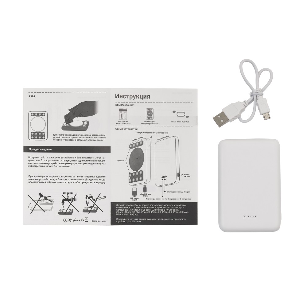 Аккумулятор подходит для мобильных устройств Qi (Ци) стандарта. Данная технология является универсальной, её используют производители смартфонов, работающих на платформе android и iOS. В характеристиках смартфона должна быть обозначена поддержка беспроводной зарядки.Также мобильные устройства можно зарядить проводным способом при помощи входящего в комплект кабеля.
