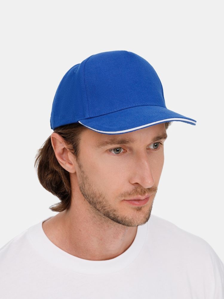 Модель бейсболки с 5-ю клиньями без лобового шва из плотного чесаного хлопка.