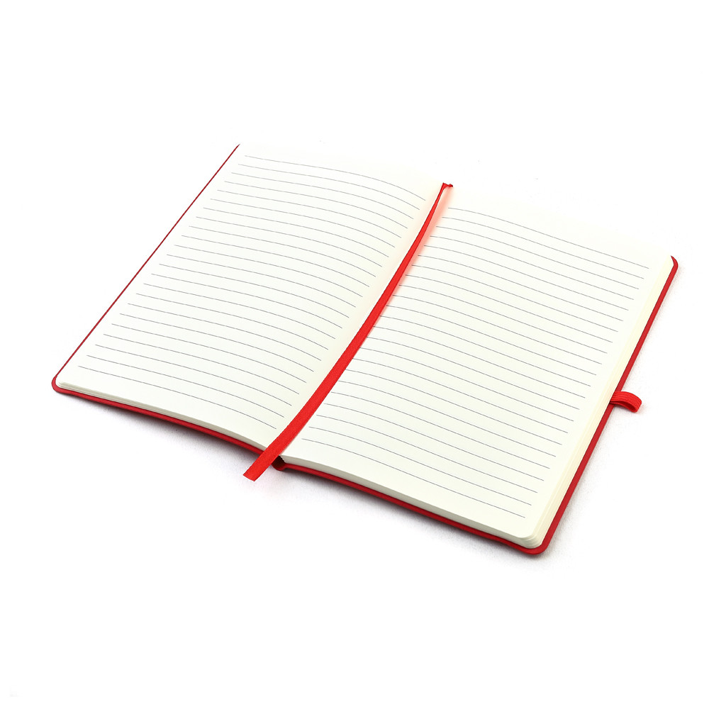 Блокнот формата А5 с мягким покрытием из PU-материала с имитацией рисунка кожи, с эластичной застежкой и текстильной закладкой, наличие петли для ручки в цвет блокнота, 192 страницы, плотность 70г/м, страницы с черными линиями. Цвет по PANTONE® (максимально приближен): 186C.