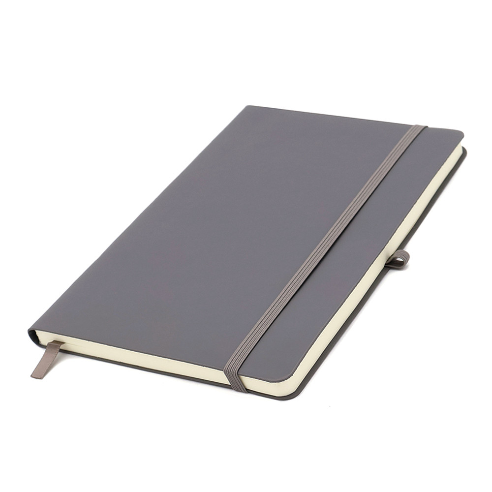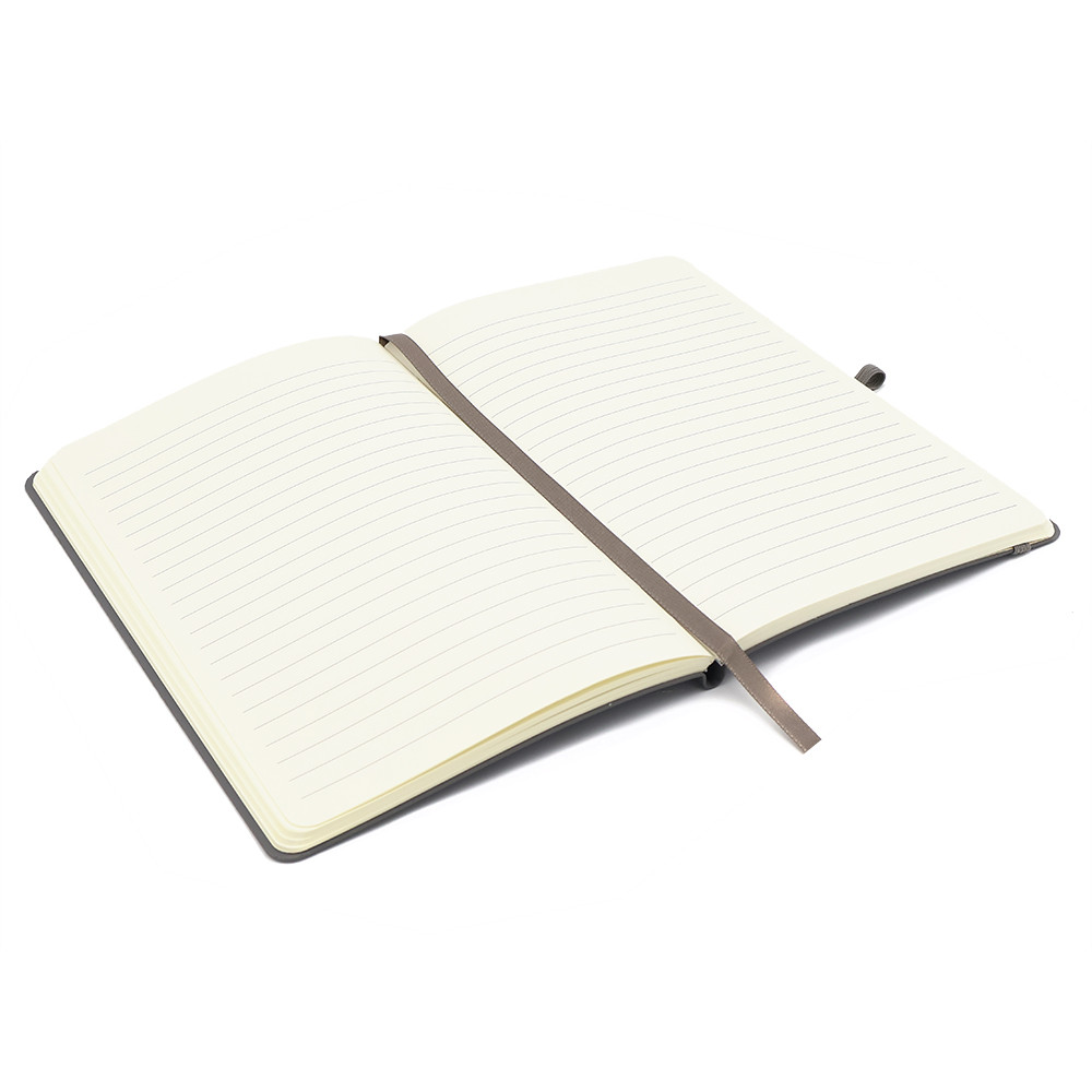 Блокнот формата А5 с мягким покрытием из PU-материала с имитацией рисунка кожи, с эластичной застежкой и текстильной закладкой, наличие петли для ручки в цвет блокнота, 192 страницы, плотность 70г/м, страницы с черными линиями.