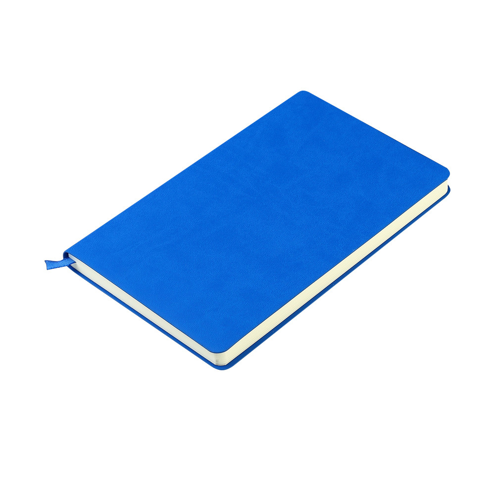 Блокнот формата А5 с мягкой обложкой из PU-материала, имеющего текстуру, имитирующую поверхность натуральной кожи; с текстильной закладкой в цвет блокнота, 256 страниц, плотность 70г/м, страницы с черными линиями. Цвет по PANTONE® (максимально приближен): 2728C.