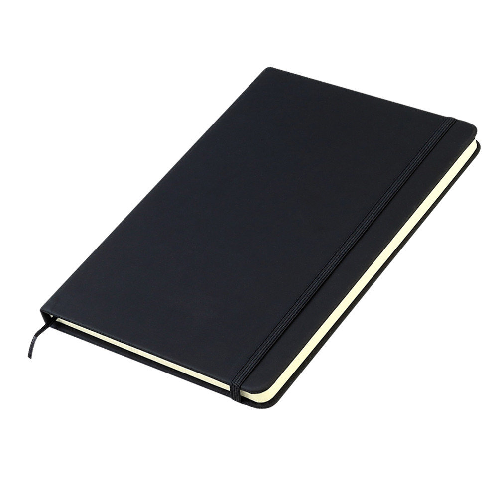 Блокнот формата А5 с твердым покрытием из PU-материала с имитацией рисунка кожи, с эластичной застежкой для закрытия и текстильной закладкой в цвет блокнота, 192 страницы, плотность 70г/м, страницы с черными линиями.