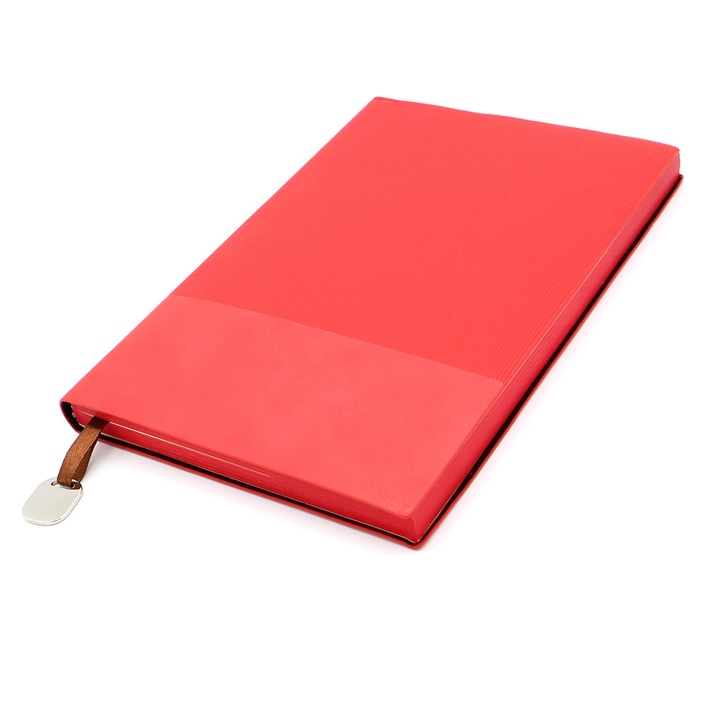 Блокнот формата А5 в гибкой обложке из искусственной кожи. Материал обложки — термополиуретан. Текстура — сверху на 2/3 ребристая, на треть снизу — гладкая для нанесения вашего логотипа. Размеры: 210*145 мм, 240 страниц / 120 листов, страницы разлинеенные, бумага плотностью 80 г/м2. Срез страниц прокрашен в цвет обложки блокнота. В аксессуарах представлены: ляссе c металлической биркой. На бирку можно заказать нанесение логотипа вашей компании.