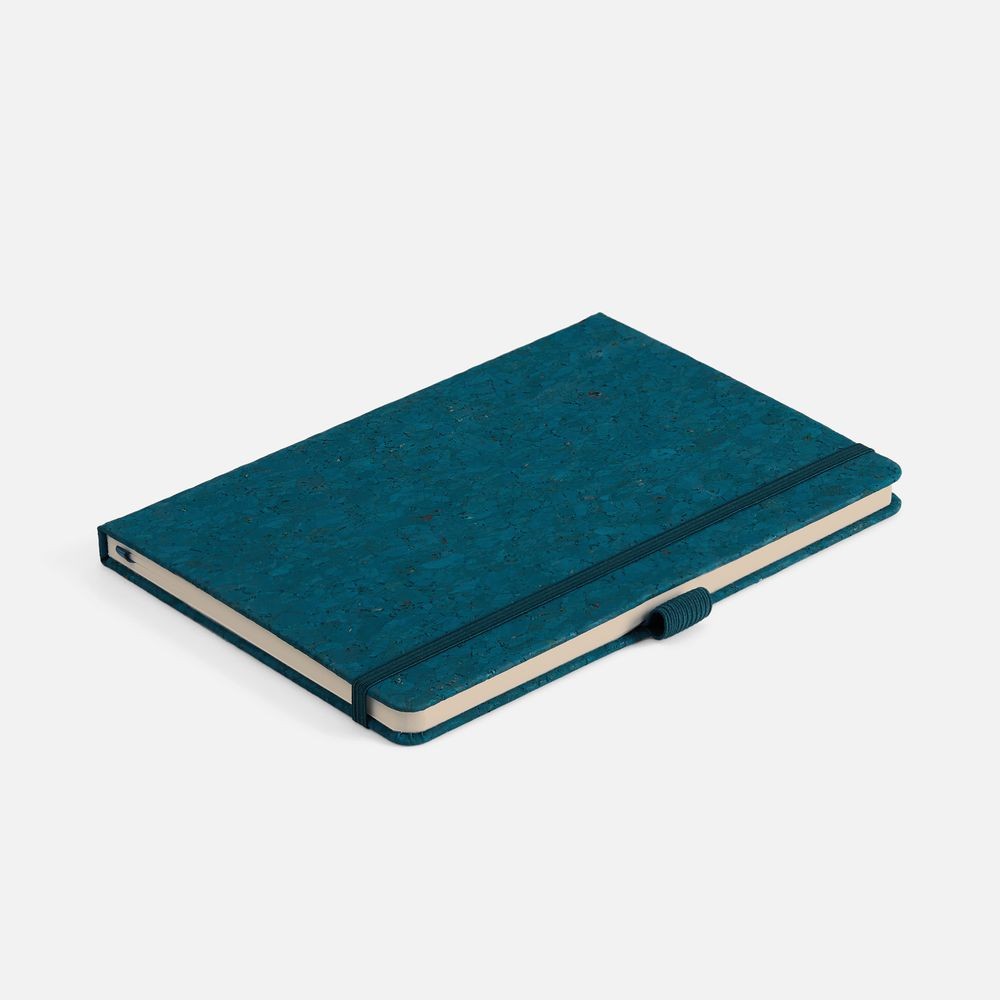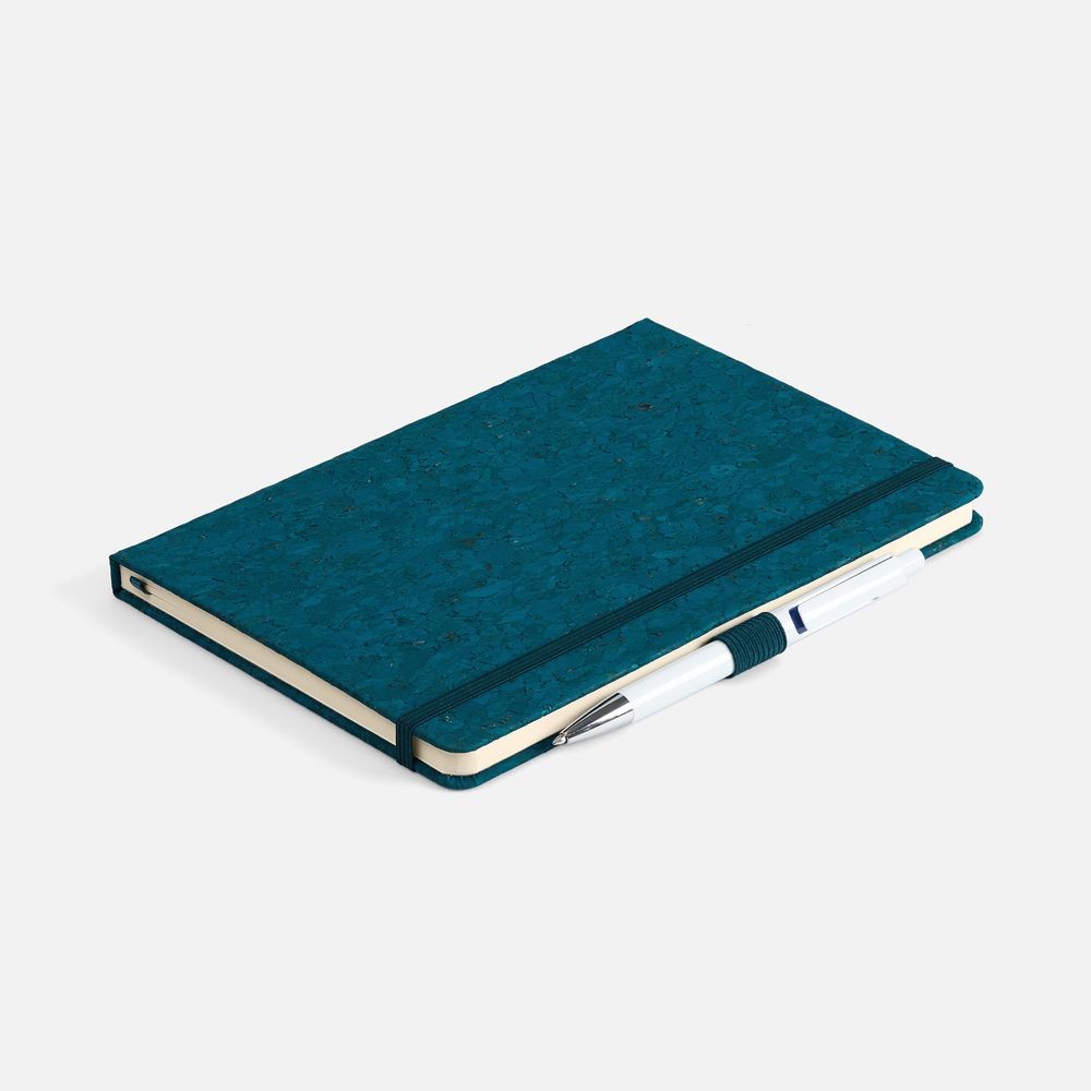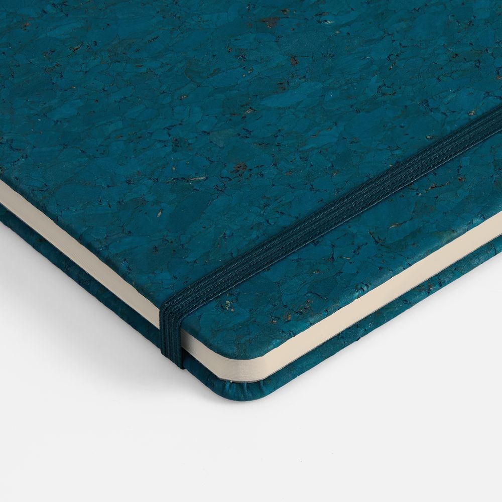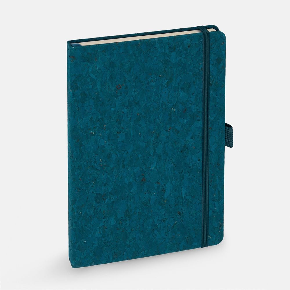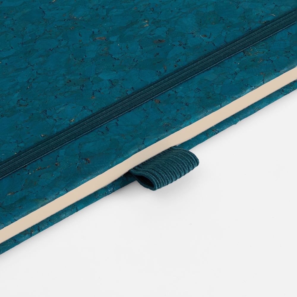 Блокнот с твердой обложкой из натуральной окрашенной пробки, дополнен петлей-резинкой для ручки, ляссе и резинкой в цвет обложки.