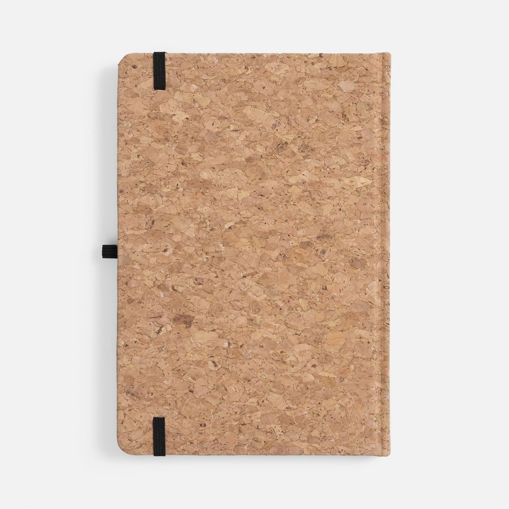 Блокнот в твердой обложке из натуральной неокрашенной пробки, дополнен цветными петлей-резинкой для ручки, ляссе и резинкой на обложку.