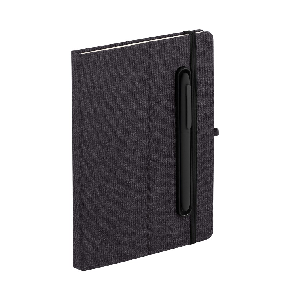 - Блокнот формата А5 с резинкой-фиксатором и встроенным в обложку магнитным держателем для ручки. Внутренний блок состоит из 160 страниц в линейку бумаги плотностью 70 г/м2. Материал обложки изготовлен из переработанного (RPET) пластика. Магниты прочно и надёжно закрепляют металлическую ручку на обложке. Бонус – обложка трансформируется в удобную подставку для смартфона/планшета/ноутбука;