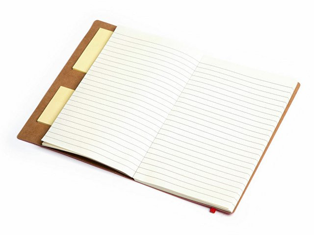 Набор включает в себя разноцветные стикеры разных размеров, блокнот с линованной бумагой и ручку c корпусом из переработанного картона. Обложка выполнена из фактурной искусственной кожи, которая, при тиснении, меняет цвет на более глубокий.