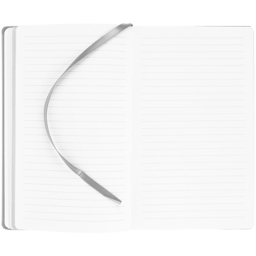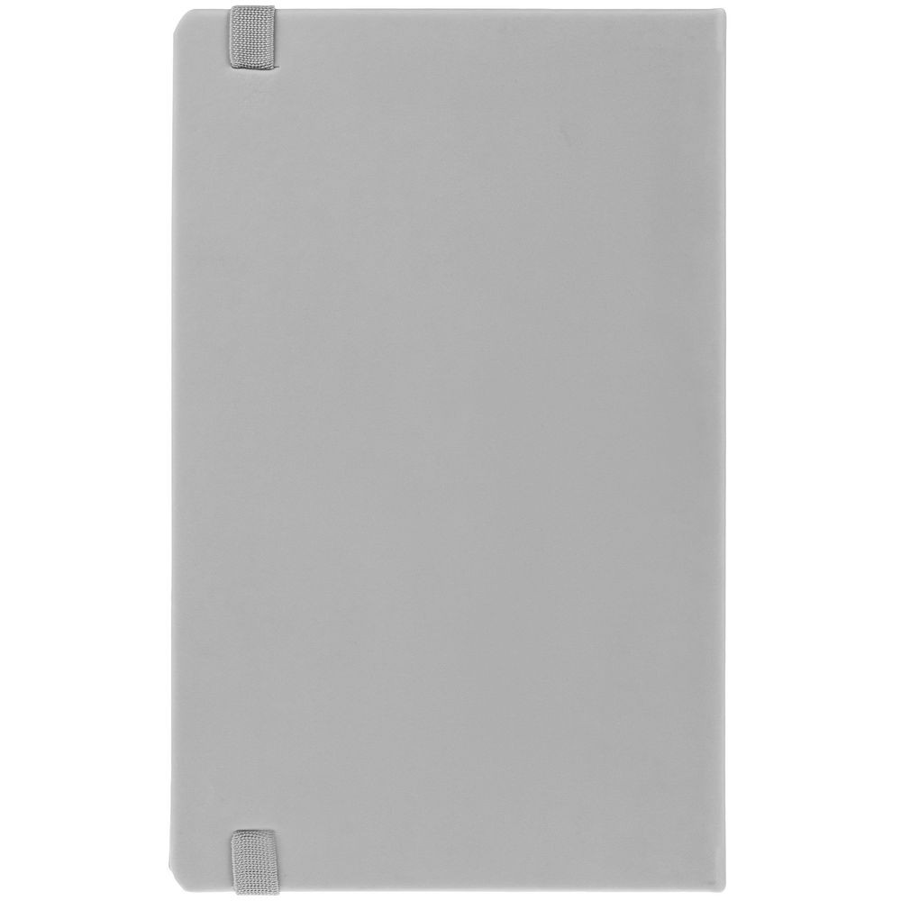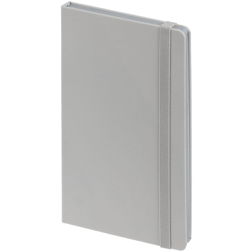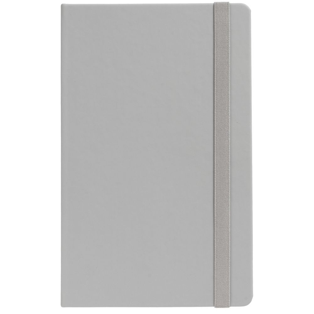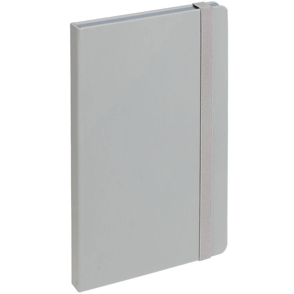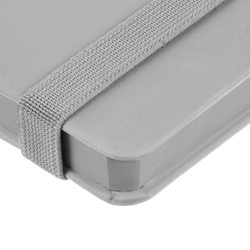 Блокнот в твердой обложке, выполнен из материала Soft Touch, серый СС, дополнен резинкой и ляссе в цвет обложки.