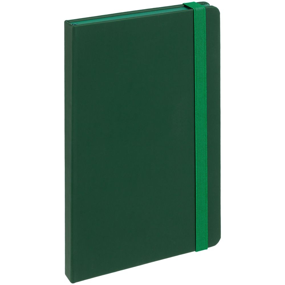 Блокнот в твердой обложке, выполнен из материала Soft Touch, зеленый FF, дополнен резинкой и ляссе в цвет обложки.