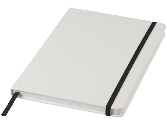 Белый блокнот A5 с цветной эластичной закладкой и резинкой. 96 страниц (60g/m2), линованная бумага. На обложке возможна цифровая печать.