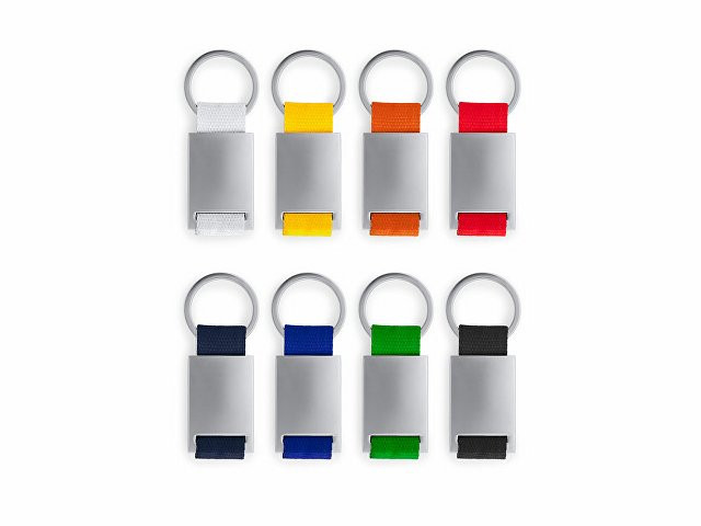 Металлический брелок с цветной полосой из полиэстера.