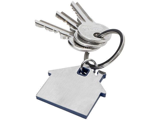 Брелок для ключей в форме домика с цветной вставкой из пластика между 2-мя серебристыми пластинами из стали.