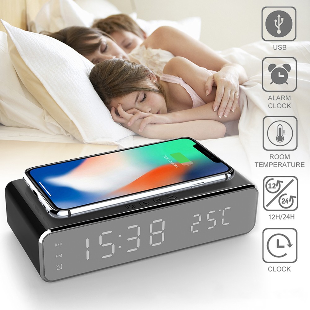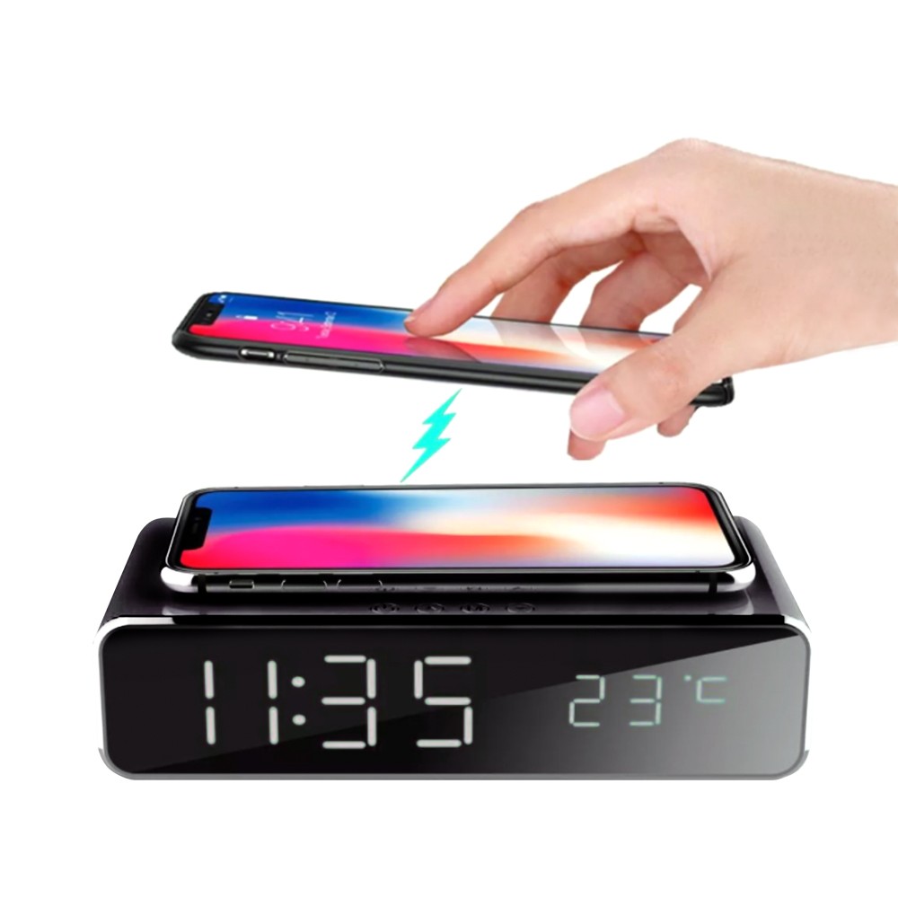 Часы имеют простой и элегантный дизайн с LED дисплеем, на котором отображается комнатная температура. Устройство позволяет устанавливать три разных времени будильника для вашего удобства. Наверху часов расположен модуль для беспроводной зарядки с мощностью 5 Вт, что позволяет быстро и удобно заряжать ваш смартфон. Размеры упаковки часов составляют 17.4 x 10.4 x 5 см. Для работы беспроводной зарядки необходимо подключать устройство к сети через адаптер.