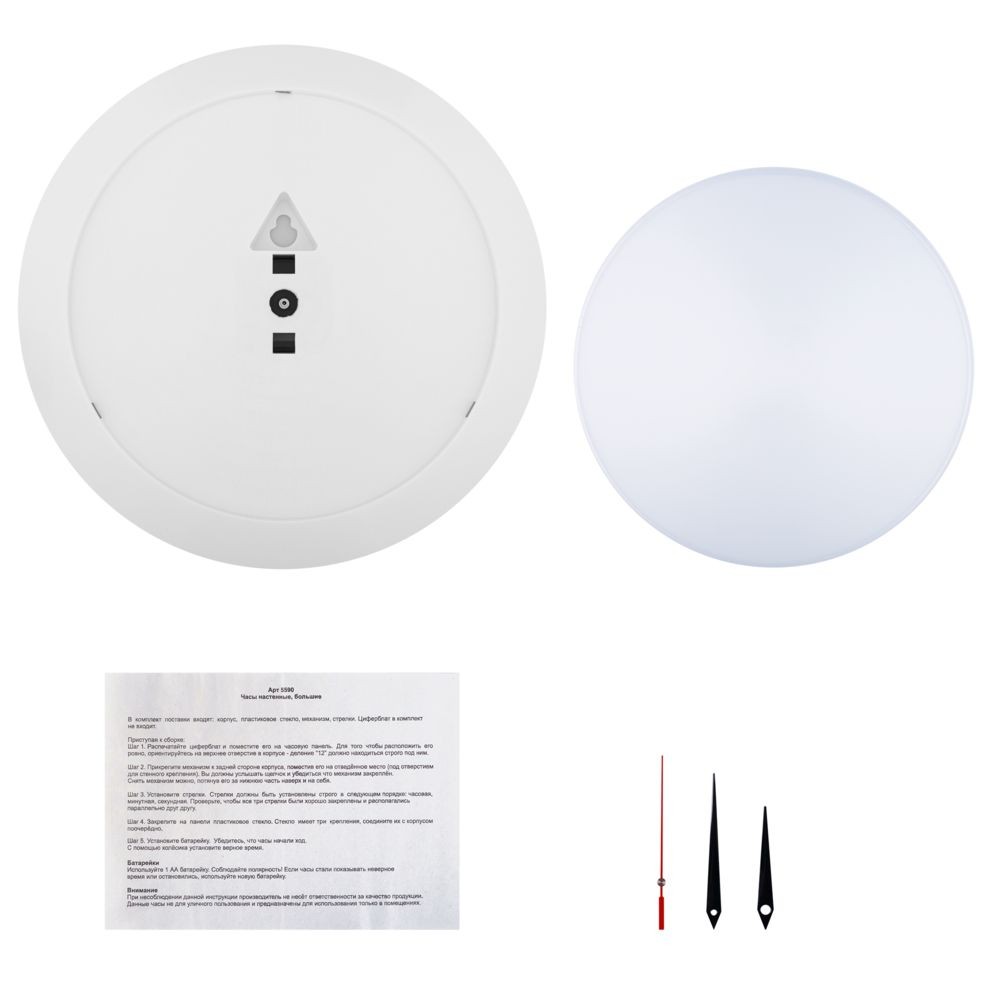 Часы поставляются в разобранном виде: корпус, крышка, стрелки, механизм и индивидуальная упаковка — коробка. Часовая и минутная стрелки — черного цвета, секундная — красного цвета.
