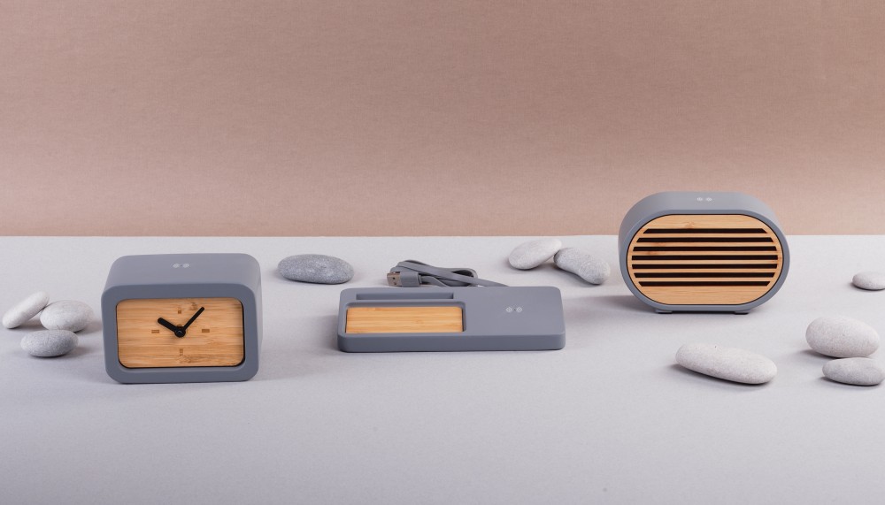 Часы «Stonehenge» в благородном исполнении природных материалов сочетают в себе функцию беспроводного зарядного устройства.