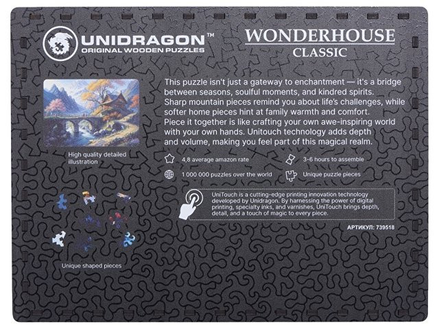 Уникальные фигурные детали этого пазла похожи на извилистые горные тропы. Это — полный откровений лабиринт, в котором два странника ищут путь к себе. Мягкий черно-белый туман расступается перед ними, чтобы показать вершину храма, как воплощение далекой мечты. Там они найдут совершенное спокойствие и умиротворение. У пазла уникальный — гипнотический — рез. Детали меняются от жестких геометричных, до мягких и извилистых, чтобы в конце концов сойтись к храму в центре картины «воронкой», в которой исчезнут все ваши тревоги и заботы. Атмосферная черно-белая иллюстрация позволит с головой погрузиться в сборку. А фирменная технология печати Unitouch дарит ей глубину и объем, который оживет под вашими пальцами. Этот пазл — вдохновение, которое укроет вас от суеты и погрузит в мир, где время замирает. - Количество деталей: 500шт. - Размер собранного пазла: 42х29,7см - Длительность сборки: от 6 часов - Детали уникальной формы - Прочные и долговечные детали с безупречным сцеплением - Премиальная подарочная коробка из дерева, которую можно персонализировать