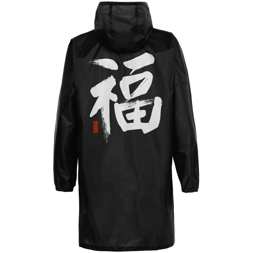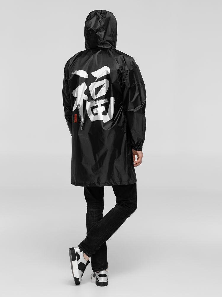 Иероглифы коллекции «Вечные ценности» выполнены в жанре каллиграфии на древнекитайском диалекте мандарин. Плавные линии символизируют внутренний баланс и фокусировку на главных жизненных ориентирах.Плащ-дождевик из ткани таффета на молнии с капюшоном. Складывается в мешочек — удобно брать с собой.