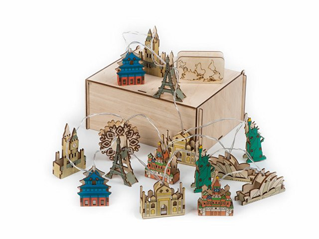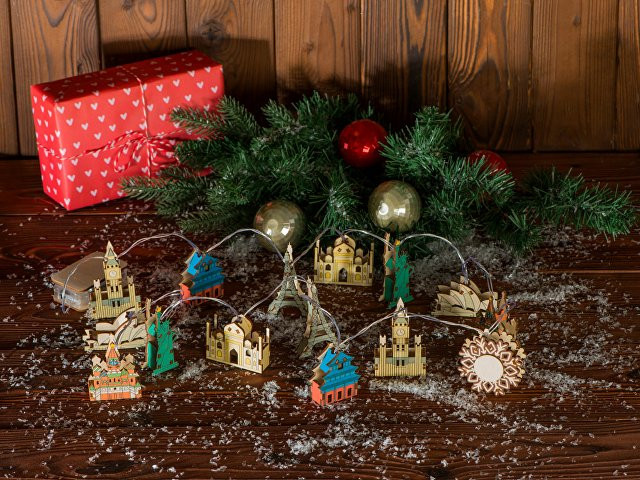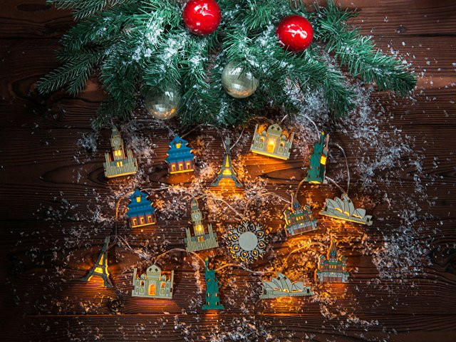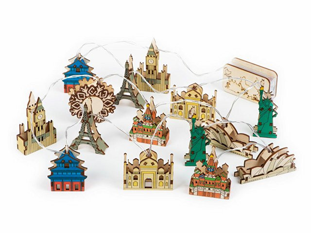 Новогодняя ёлочная гирлянда постоянного свечения с цветными фигурками достопримечательностей из натуральной березовой фанеры сделает процесс украшения ёлки или дома не только увлекательным, но и познавательным! Гирлянда состоит из 14 парных фигурок достопримечательностей и центрального элемента в виде снежинки. Снежинка и корпус батарейного блока имеют дополнительные съемные панели, которые поставляются в наборе в виде отдельных деталей и крепятся на изделие на двусторонний скотч. Эти элементы специально предназначены для нанесения и придания презенту уникальности. Гирлянда работает от 2-х батареек АА, которые входят в комплект. На гирлянде изображены следующие достопримечательности: Биг Бен (Лондон, Англия) Храм неба (Пекин, Китай) Эйфелева башня (Париж, Франция) Тадж-Махал (Агра, Индия) Статуя Свободы (Нью-Йорк, США) Сиднейская опера (Сидней, Австралия) Храм Василия Блаженного (Москва, РФ)