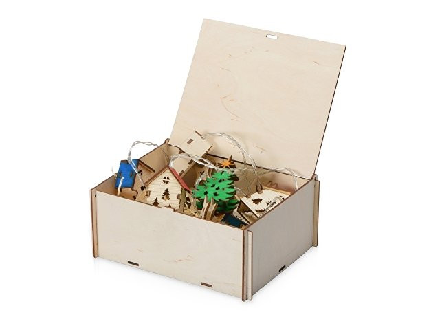 Расчет нанесенияСветодиодная новогодняя елочная гирлянда постоянного свечения с цветными фигурками из натуральной березовой фанеры. Работает от 2-х батареек АА (в комплекте). Упакована в деревянную подарочную коробку со стружкой.