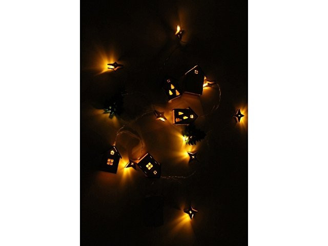 Светодиодная новогодняя елочная гирлянда постоянного свечения с цветными фигурками из натуральной березовой фанеры. Работает от 2-х батареек АА (в комплекте). Упакована в деревянную подарочную коробку со стружкой.