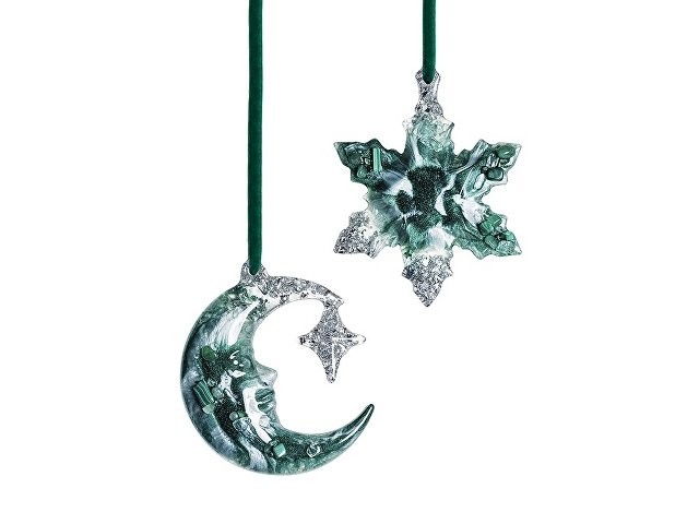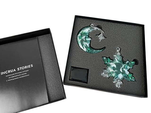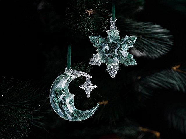 Набор из 2-х елочных игрушек: в форме месяца и снежинки. Игрушки выполнены из ювелирной эпоксидной смолы и украшены галтовкой из натуральных минералов. Игрушки бережно упакованы в картонную коробку с внутренним вкладышем, который надежно фиксирует их внутри. Для вашего удобства к каждой игрушке прилагается элегантная ленточка, с помощью которой вы легко сможете подвесить их на ёлку.