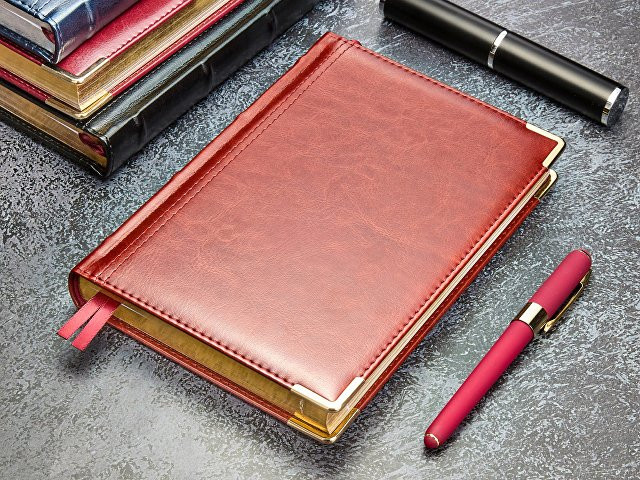 Полудатированный ежедневник «Boss» от бренда Bruno Visconti - это качественный корпоративный подарок по выгодной цене, произведенный специально под персонализацию. Представлен в универсальном формате А5 и состоит из 416 страниц. Классический деловой ежедневник линии Boss – образец элегантности. Гладкую тонкую фактуру экокожи подчеркивает декоративная строчка по контуру и металлические закругленные уголки золотистого цвета. В ежедневнике есть полезная справочная информация и телефонная книга, а также страницы для записи идей, мыслей и составления рабочих планов. Есть перфорация (нижние уголки отрывные). Для изготовления страниц используется качественный бежевый офсет повышенной плотности (80 г/кв м), которая производится японской фирмой "Daiwa" и подходит для всех видов чернил. Ежедневник можно персонализировать с помощью тиснения обложки - золотой или серебряной фольгой. Наши ежедневники помогут быть успешным и эффективным в карьере и повседневной жизни!