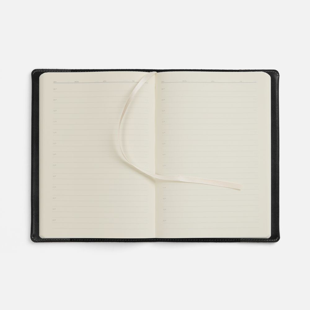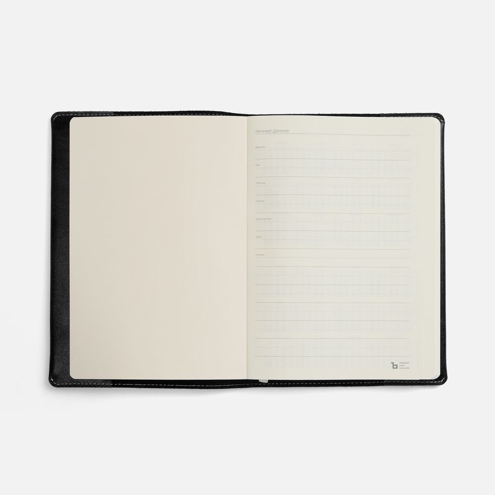 Ежедневник в мягкой суперобложке из натуральной кожи. Дополнен ляссе кремового цвета. Упакован в индивидуальную коробку.
