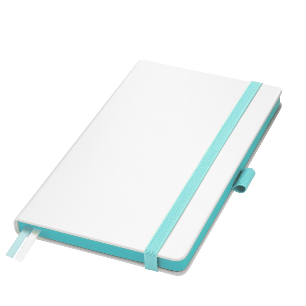 Недатированный ежедневник выполнен в жесткой обложке из искусственной кожи со скругленными уголками. Переплетный материал гладкий, с легкой естественной паутинкой морщин, имеет полуглянцевый блеск. Цвет – чистый белый. Бирюзовые матовые форзац и нахзац, а также бирюзовый срез блока создают оригинальный динамичный цветовой ансамбль и подчеркивают белизну обложки. Страницы светло-кремового цвета, из гладкого офсета, слегка шелковистые, со скругленными уголками. Добавляют изделию мягкую комфортную теплоту. Двойное атласное ляссе составлено из бирюзовой и белой лент. Каждая шириной 6 мм, имеет легкий блеск. Вертикальная фиксирующая резинка прочная, надежная и удобная, в тон срезу. Есть петелька для ручки в тон резинки. Карман на заднем форзаце.