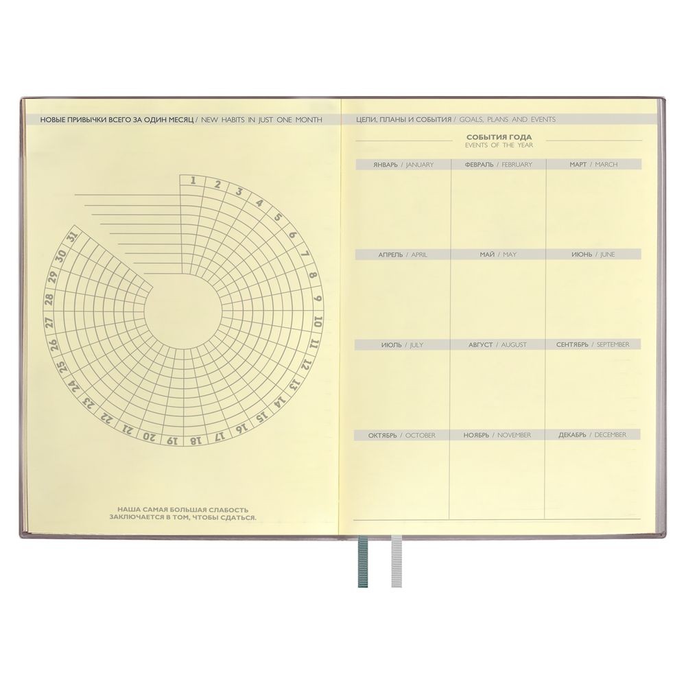Ежедневник с гибкой обложкой и закладкой из искусственной кожи, дополнен капталом и двойным ляссе.