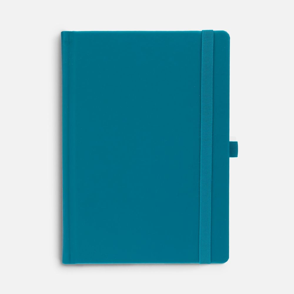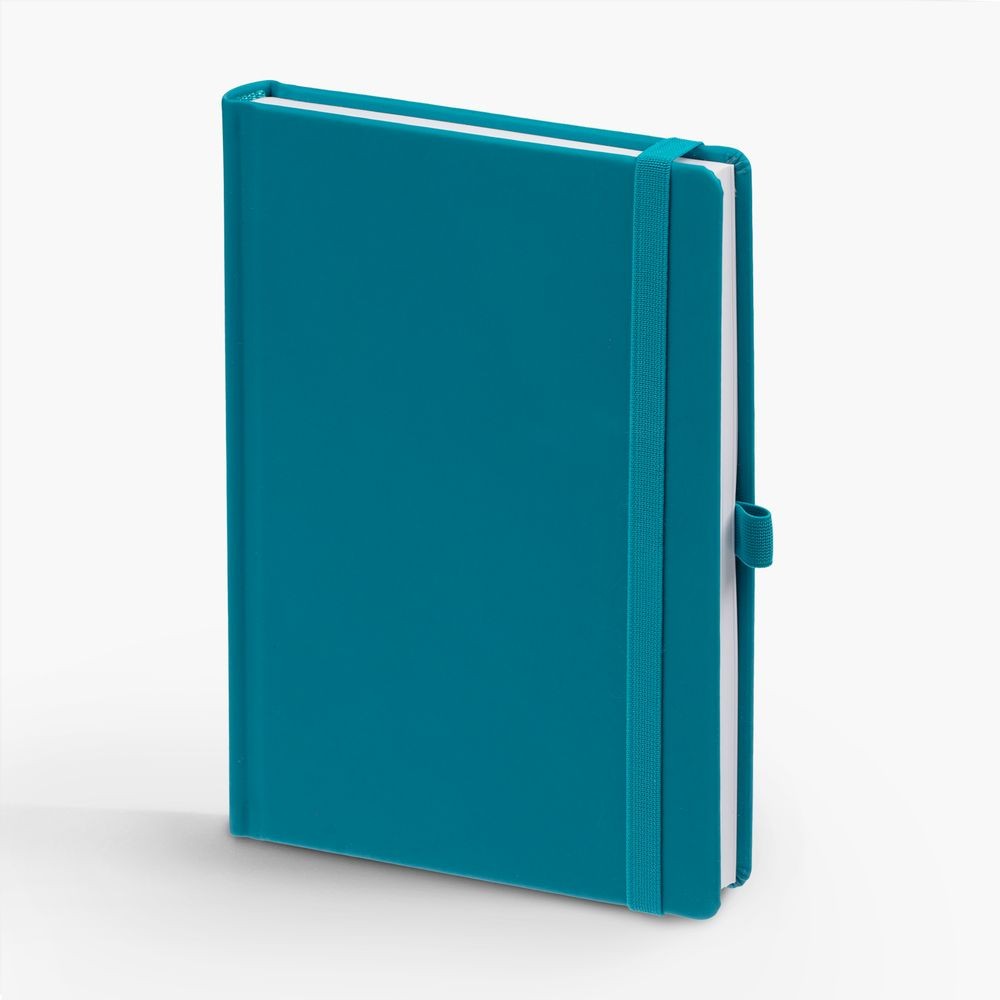 Ежедневник с твердой обложкой без поролона, выполнен из материала Soft Touch, цвет морской волны II, дополнен резинкой шириной 1 см, петлей-резинкой для ручки, капталом и ляссе темно-бирюзового цвета.