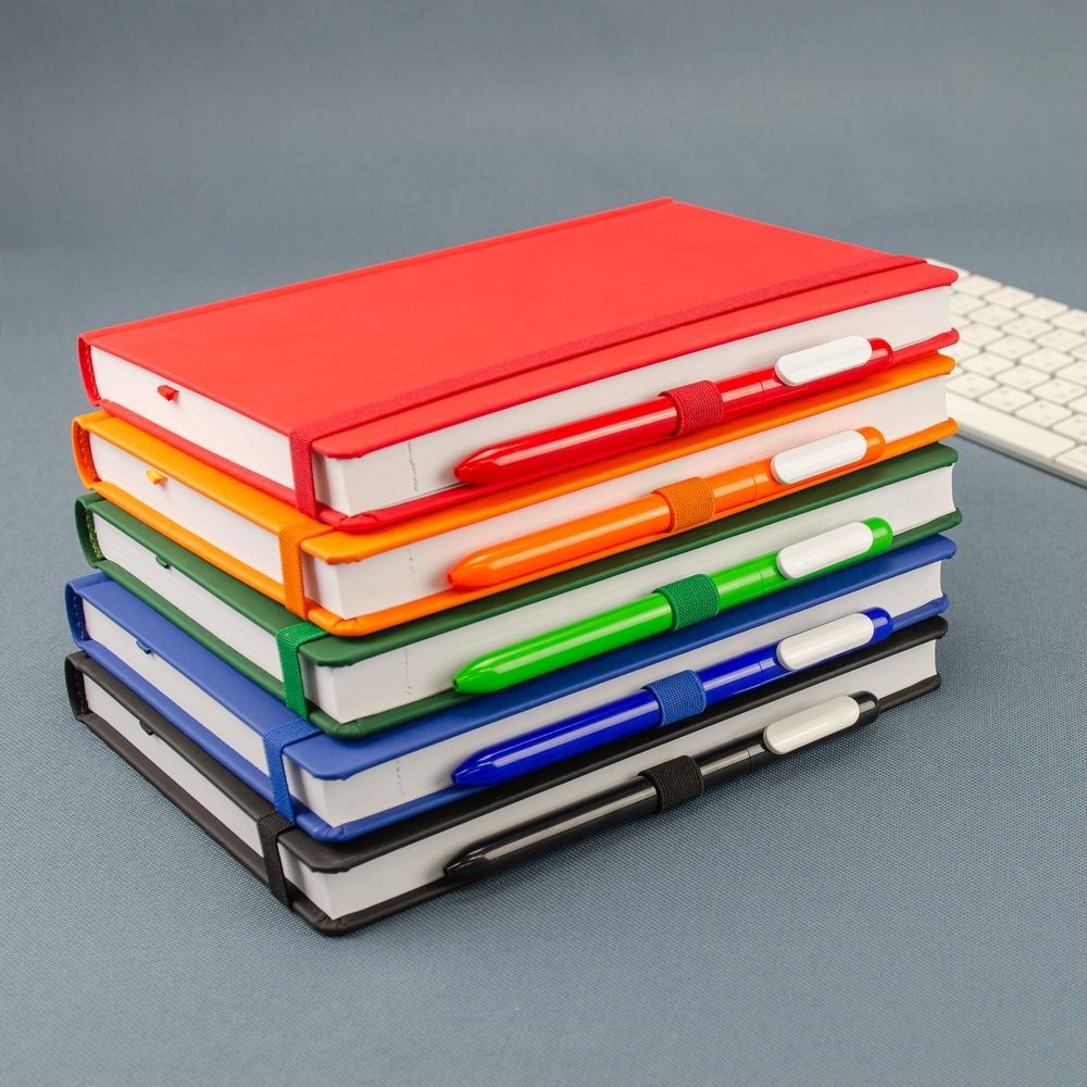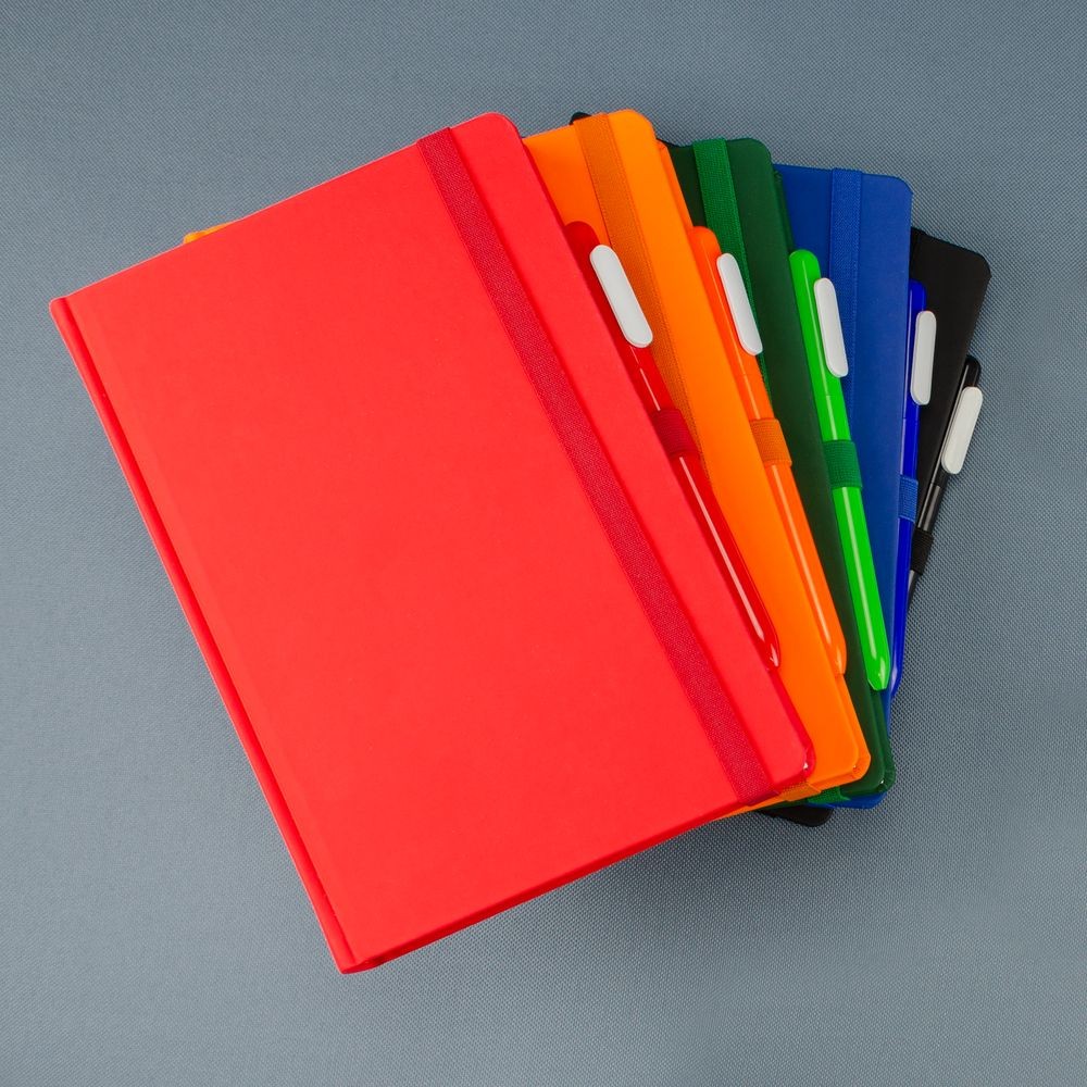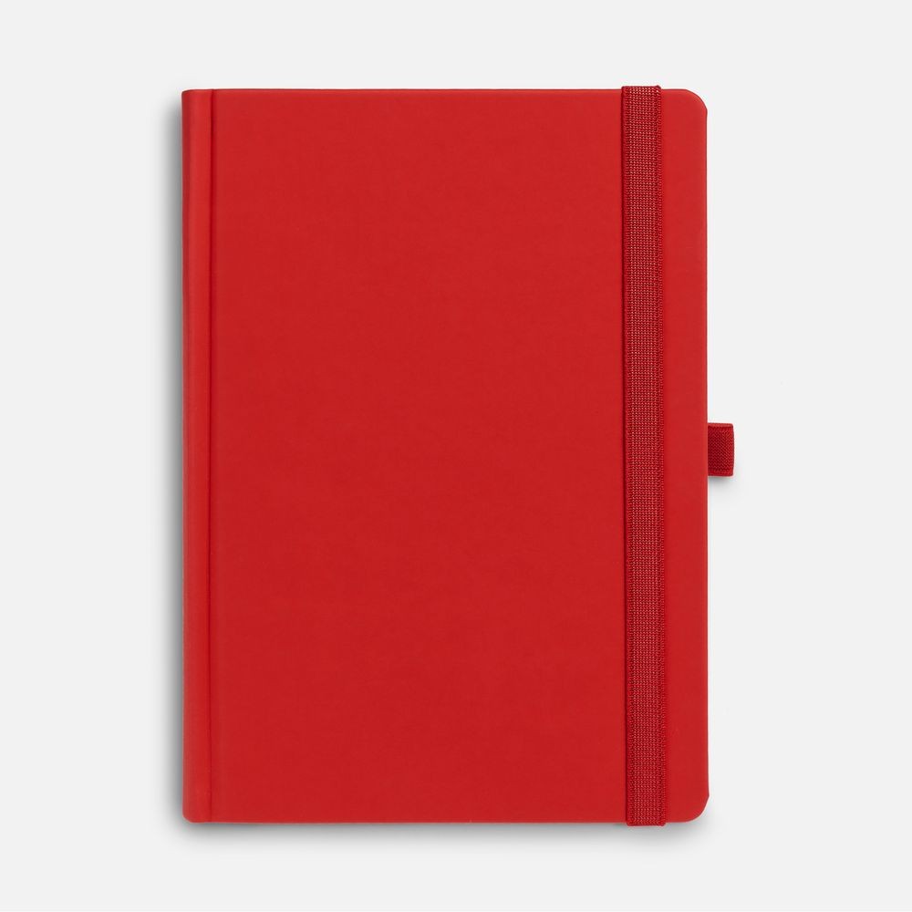 Ежедневник с твердой обложкой без поролона, выполнен из материала Soft Touch Ultra, красный РР, дополнен резинкой шириной 1 см, петлей-резинкой для ручки, капталом и ляссе красного цвета.