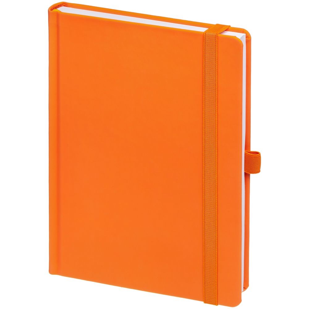 Ежедневник с твердой обложкой без поролона, выполнен из материала Soft Touch, оранжевый ОО, дополнен резинкой шириной 1 см, петлей-резинкой для ручки, капталом и ляссе оранжевого цвета.