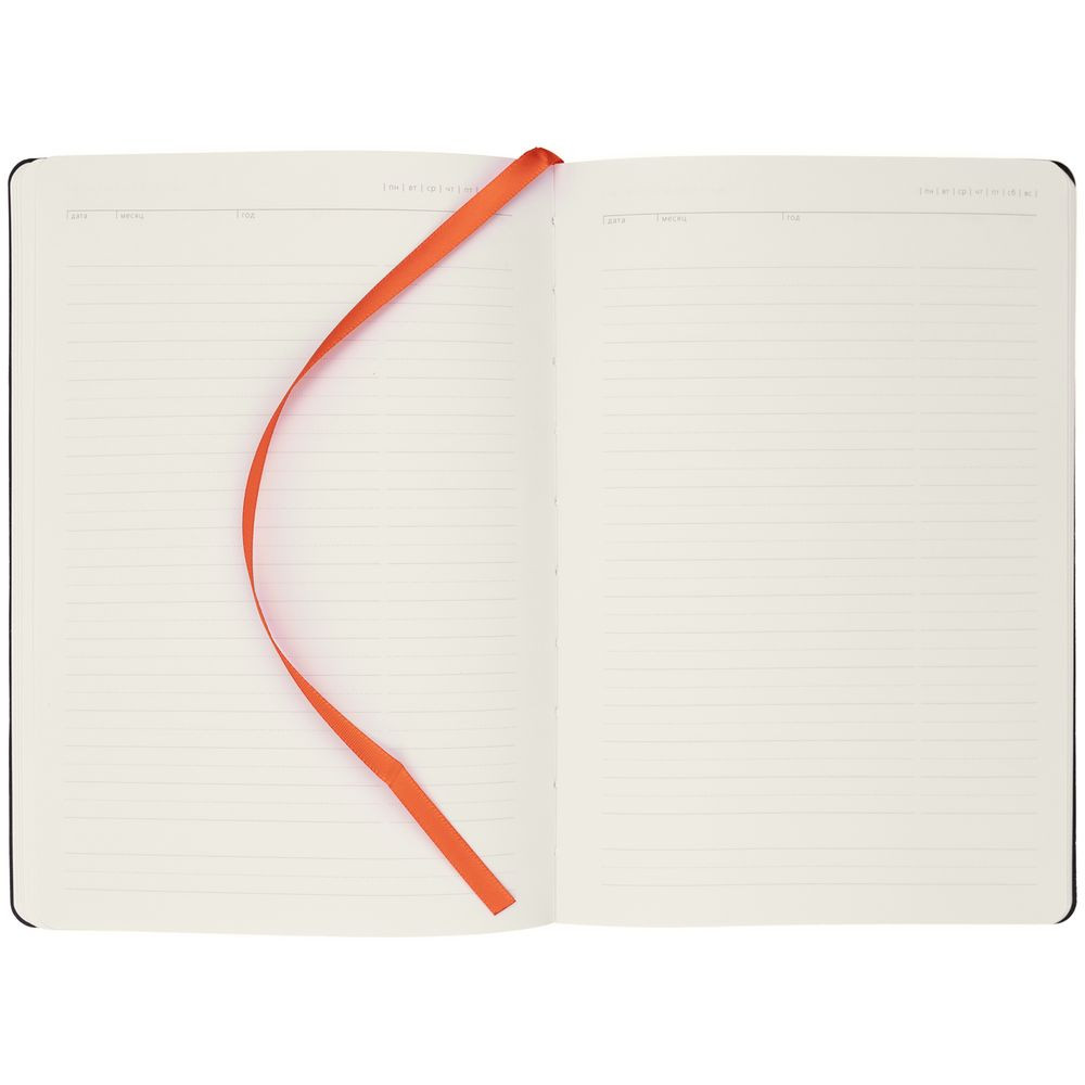 Ежедневник с гибкой обложкой, выполнен из материала Latte, оранжевый, дополнен ляссе в цвет обложки.