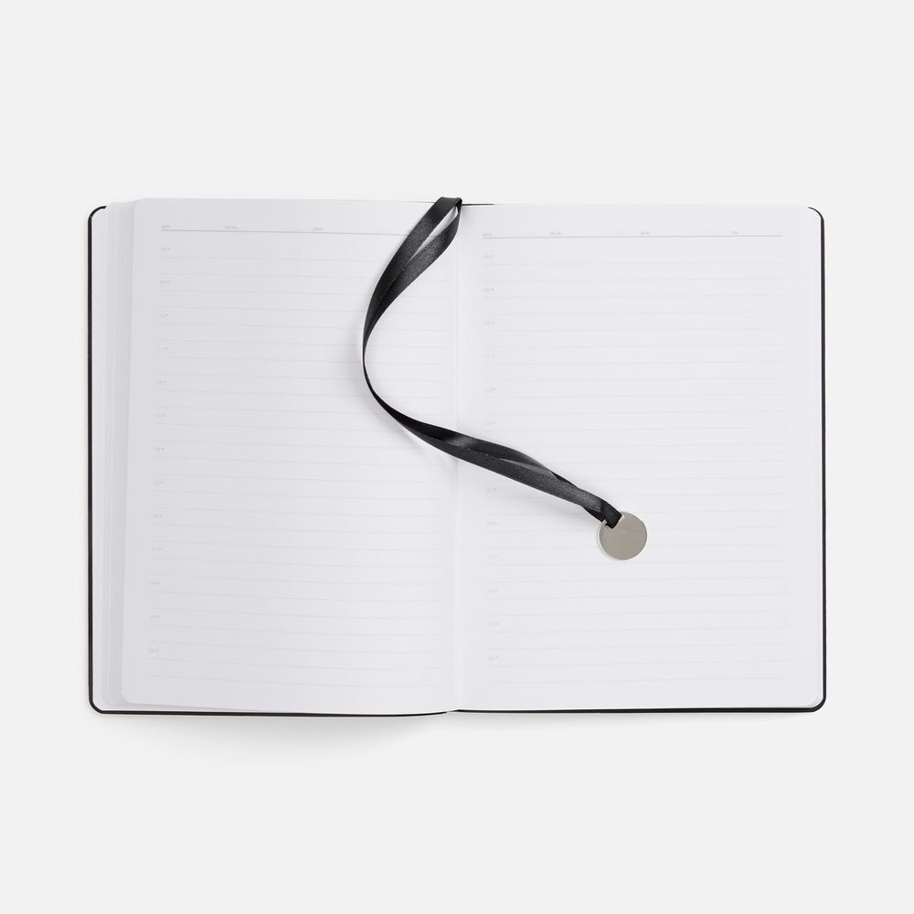 Ежедневник с гибкой обложкой, выполнен из материала La Fite, черный АА, дополнен ляссе в цвет обложки с металлическим шильдом.