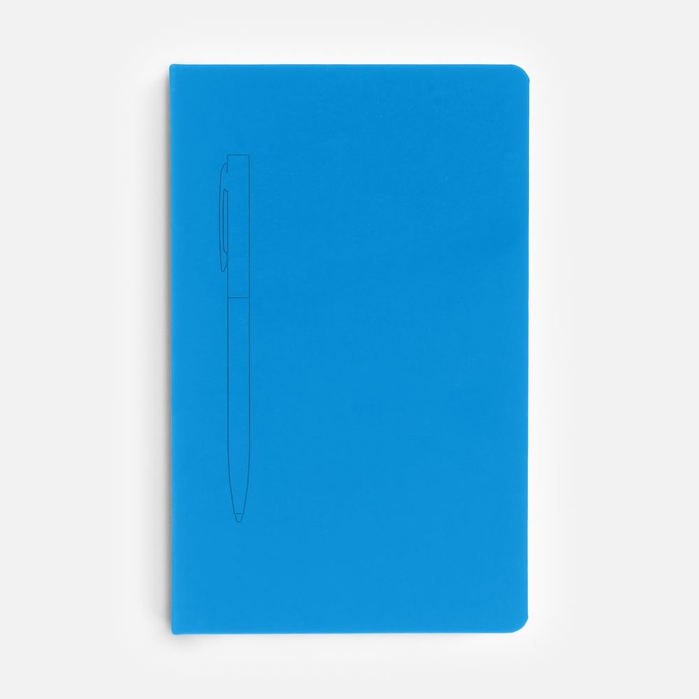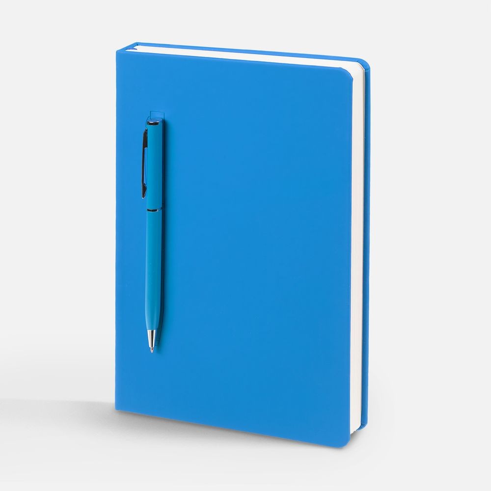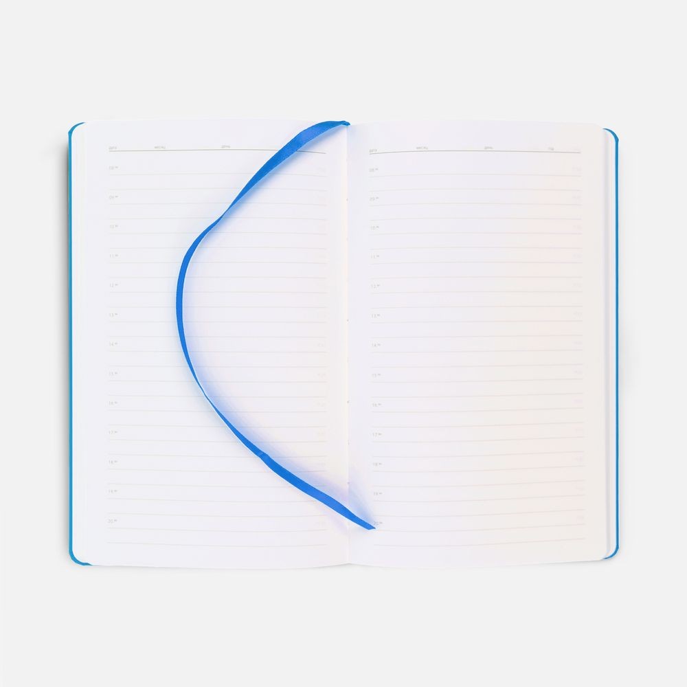 Ежедневник в твердой обложке, выполненной из материала Soft Touch Ultra, голубой JJ, дополнен атласным ляссе и магнитом, удерживающим ручку.
