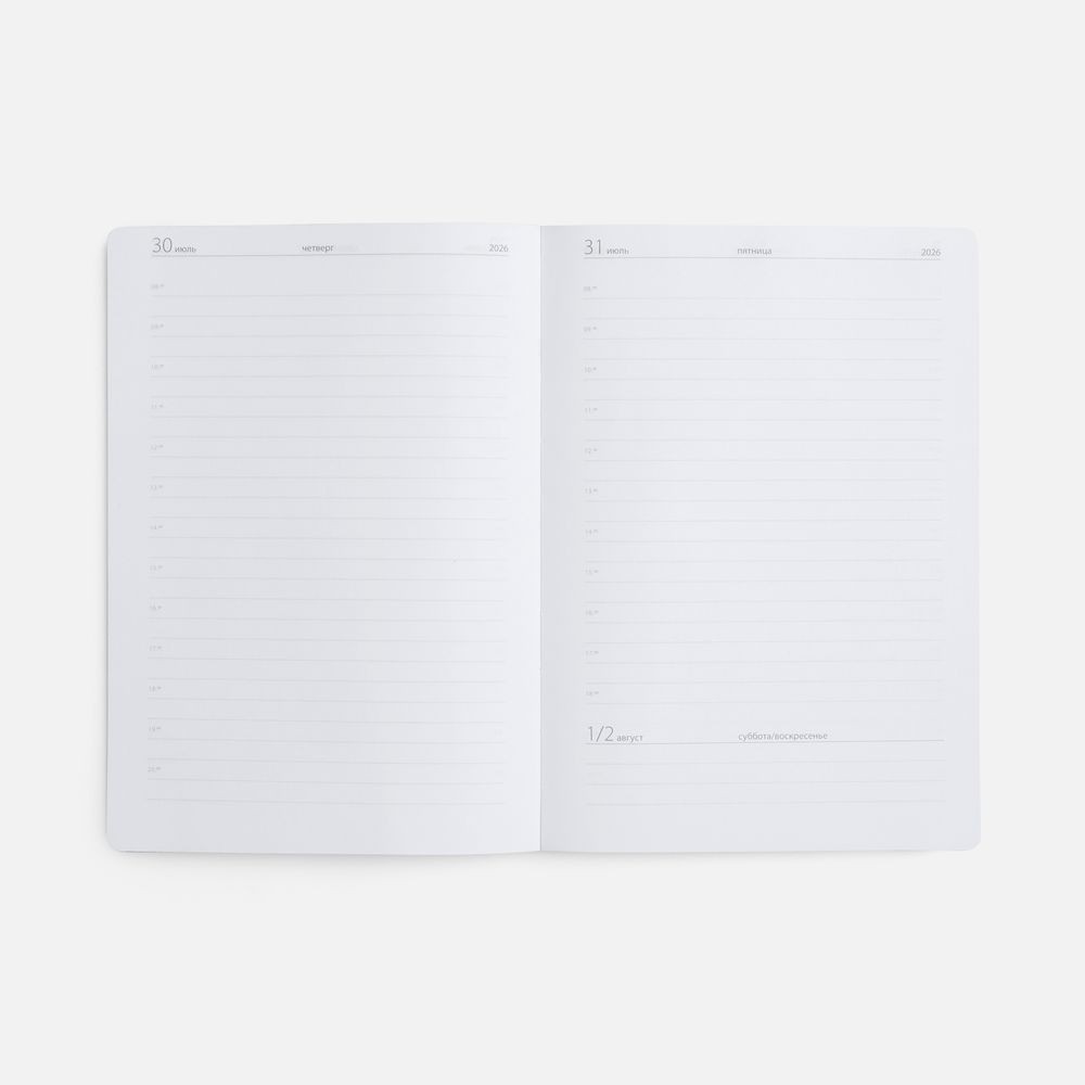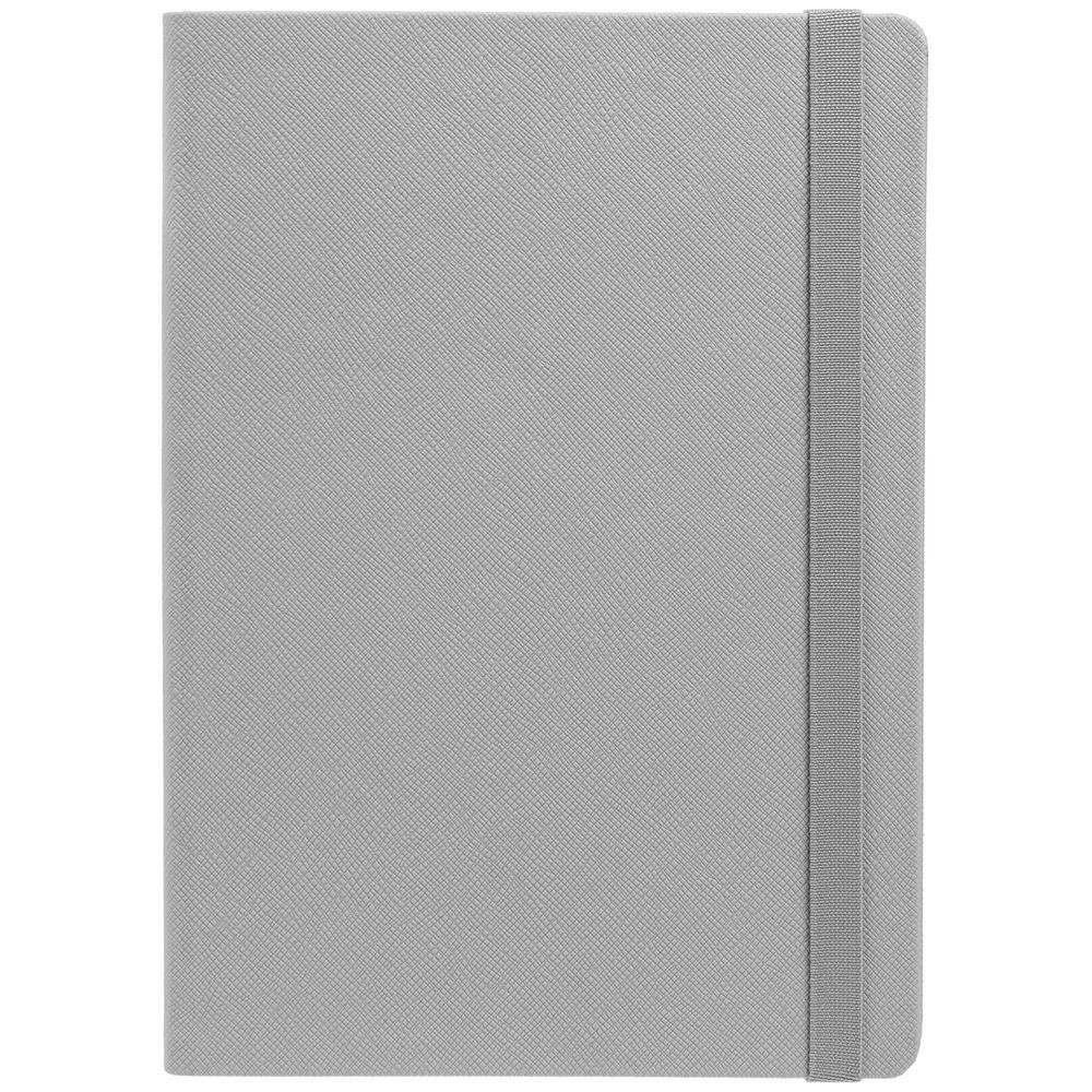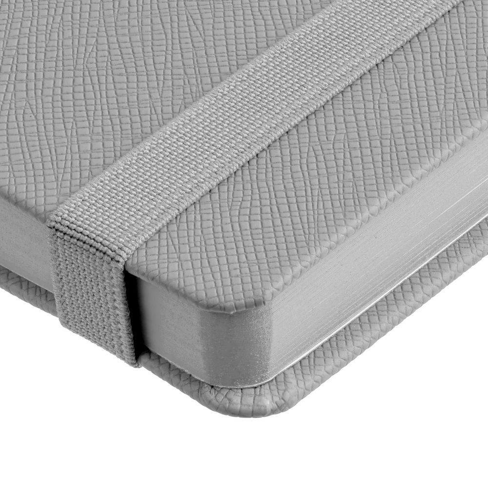 Ежедневник с твердой обложкой выполнен из материала Nice Touch, серый СС, и дополнен резинкой шириной 1 см и ляссе серого цвета.
