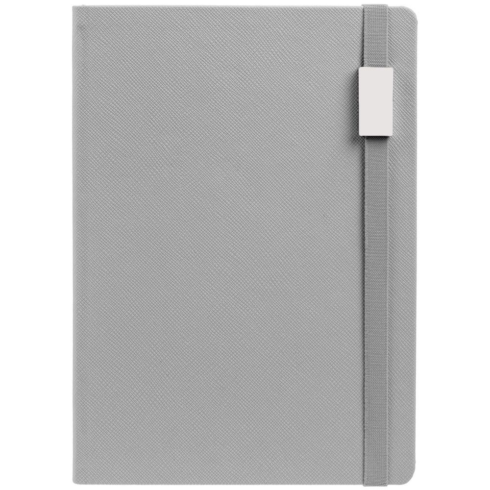 Ежедневник с полутвердой обложкой выполнен из материала Nice Touch, серый СС, и дополнен резинкой шириной 1 см с металлическим шильдом и ляссе серого цвета.