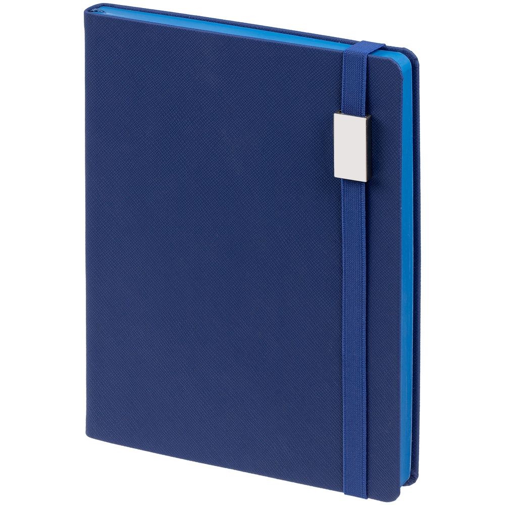Ежедневник с полутвердой обложкой выполнен из материала Nice Touch, синий НН, и дополнен резинкой шириной 1 см с металлическим шильдом и ляссе синего цвета.