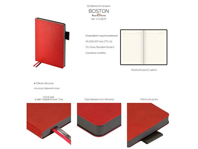 Ах, это элегантное двойное ляссе! Одна небольшая деталь так выгодно выделяет ежедневник Boston на фоне остальных. Шероховатый материал обложки придает благородства, а цветной обрез сдержанности и дерзости одновременно. Цвета двойного ляссе великолепно сочетаются с темно-синим цветом недатированного ежедневника Boston от Bruno Visconti. Красивая бежевая бумага плотностью 70 г/м, скругленный угол обложки и блока, крашеный обрез, 21 страница справочной информации. Ежедневник Boston заслуживает вашего внимания. Упакован в картонный полукороб и термопленку.