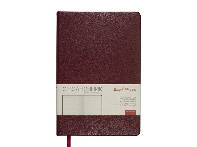 Недатированный ежедневник «Loft» формата А5 от Bruno Visconti - идеальный баланс между стилем и практичностью. Твердая обложка из высококачественной экокожи максимально повторяет фактуру натуральной кожи. Скругленные углы блока и обложки позволяют уберечь листы от замятий и придают ежедневнику утонченности и благородства. Для удобства навигации предусмотрена закладка-ляссе в цвет обложки. Внутренний блок ежедневника содержит справочную информацию на 19 страницах, телефонную книгу на 26 страницах и блок для ежедневного планирования в линейку с указанием времени суток (интервал в один час). Блок изготовлен из бежевой бумаги плотностью 70 г/кв.м.