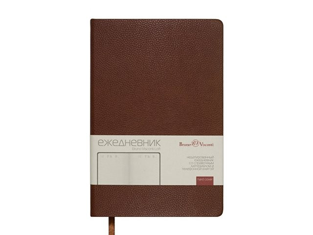 Недатированный ежедневник «Loft» формата А5 от Bruno Visconti - идеальный баланс между стилем и практичностью. Твердая обложка из высококачественной экокожи максимально повторяет фактуру натуральной кожи. Скругленные углы блока и обложки позволяют уберечь листы от замятий и придают ежедневнику утонченности и благородства. Для удобства навигации предусмотрена закладка-ляссе в цвет обложки. Внутренний блок ежедневника содержит справочную информацию на 19 страницах, телефонную книгу на 26 страницах и блок для ежедневного планирования в линейку с указанием времени суток (интервал в один час). Блок изготовлен из бежевой бумаги плотностью 70 г/кв.м.