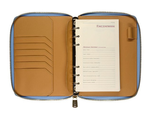 Деловая нежность! Вот как можно охарактеризовать этот очаровательный зефирно-голубой ежедневник. Большое отделение на молнии вмещает в себя и сменный блок для записей на кольцевом механизме, и отделения для визиток и ручки. В этом бизнес-аксессуаре поместятся и дополнительные документы и смартфон.