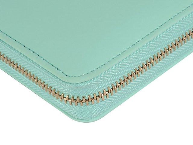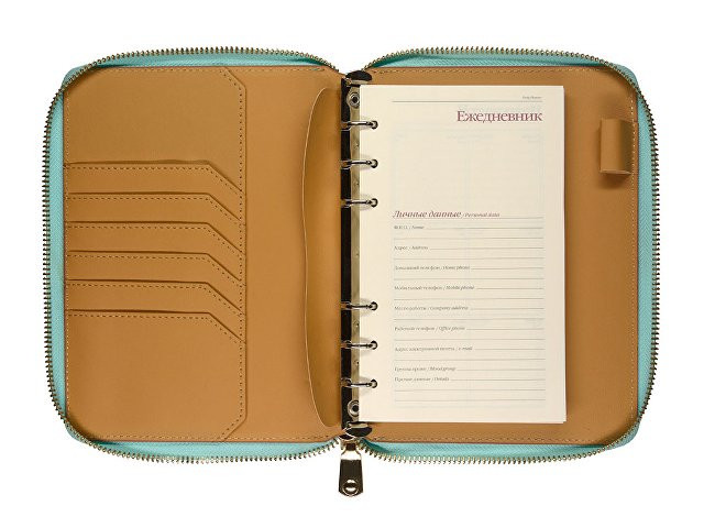 Деловая нежность! Вот как можно охарактеризовать этот очаровательный зафирно-мятный ежедневник. Большое отделение на молнии вмещает в себя и сменный блок для записей на кольцевом механизме, и отделения для визиток и ручки. В этом бизнес-аксессуаре поместятся и дополнительные документы и смартфон.