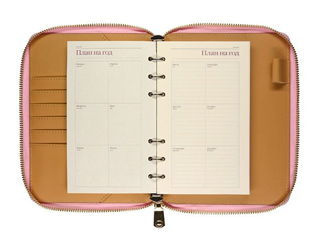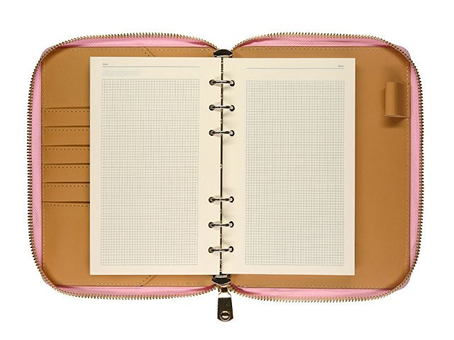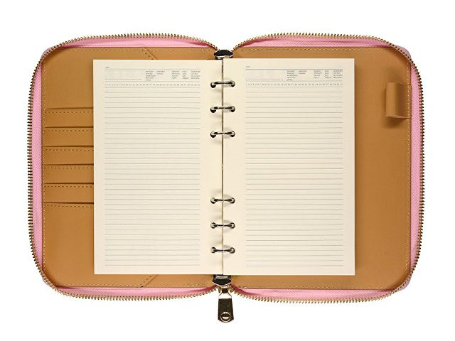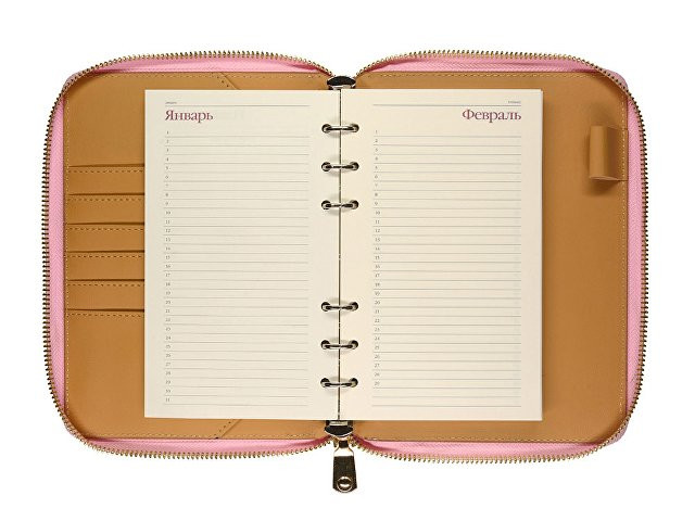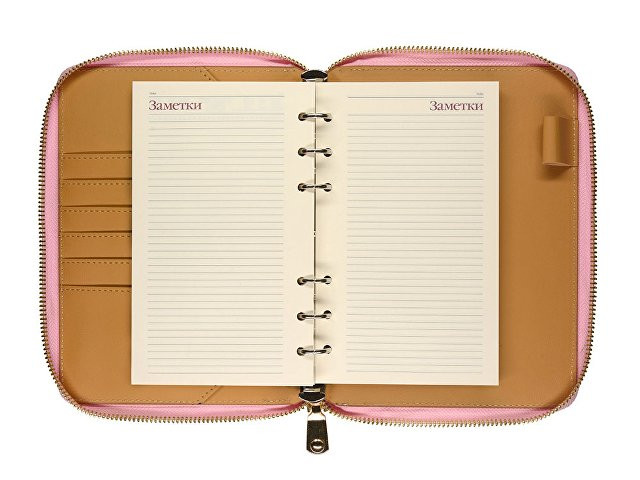 Деловая нежность! Вот как можно охарактеризовать этот очаровательный розово-зефирный ежедневник. Большое отделение на молнии вмещает в себя и сменный блок для записей на кольцевом механизме, и отделения для визиток и ручки. В этом бизнес-аксессуаре поместятся и дополнительные документы и смартфон.