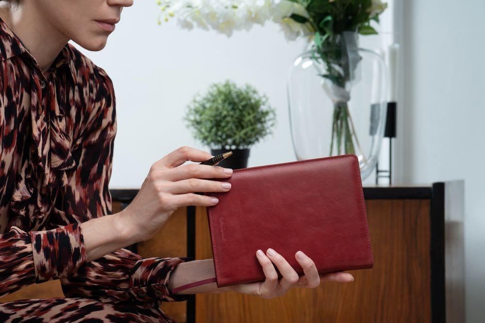 Ежедневник с полутвердой обложкой из натуральной кожи с поролоном. Каптал, репсовое ляссе и окрашенный срез обложки в цвет материала.