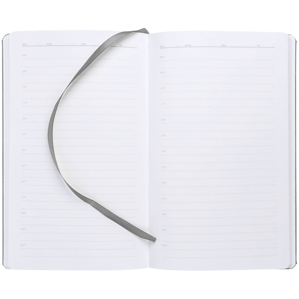 Ежедневник с твердой обложкой, выполнен из материала LaFite, серый СС, дополнен резинкой с металлическим круглым шильдом и ляссе в цвет обложки.