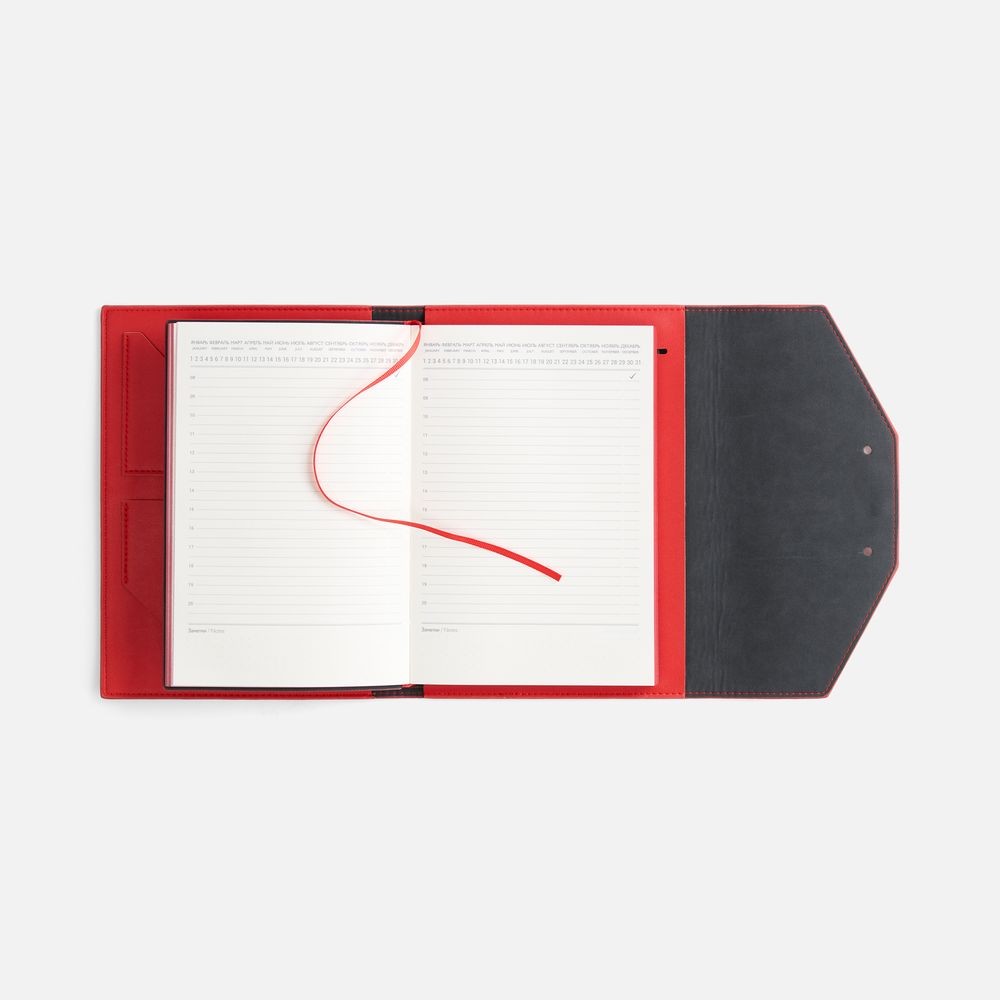 Ежедневник-органайзер в мягком переплете, формат А5+, с карманами для визиток и документов, петлей для ручки. Дополнен ляссе и капталом в цвет обложки. Клапан с прорезями застегивается на кобурные металлические кнопки.